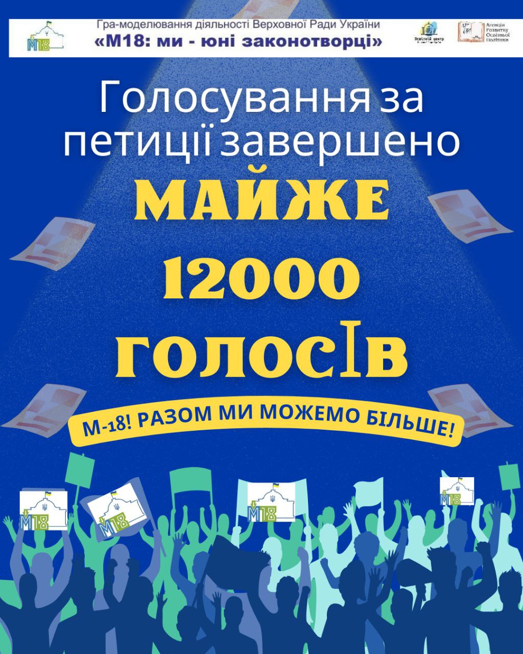 Всеукраїнська гра моделювання діяльності Верховної Ради України М18 «Ми - юні законотворці» досягла важливого етапу – завершилося голосування за петиції, створені учасниками проєкту. Молодь віком від 14 до 18 років активно долучилася до процесу, віддавши загалом майже 12 тисяч голосів за ініціативи своїх ровесників.