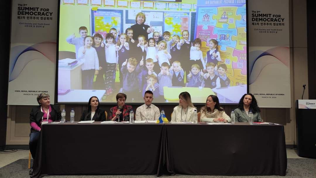 Завдяки підтримці Програми USAID «РАДА: наступне покоління» експертка Агенції розвитку освітньої політики Світлана Меркулова, координаторка проєктів у центральному регіоні взяла участь у третьому Саміті за демократію, який відбувся в Сеулі 18-20 березня, і презентувала досвід роботи шкільних осередків парламентської просвіти та мережі М18.