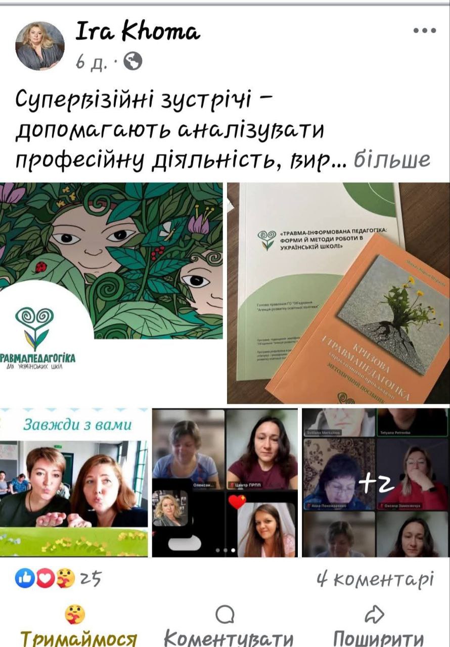 У межах міжнародного проєкту «Стійкі вчителі, стійкі діти», що реалізується Об’єднанням «Агенція розвитку освітньої політики» за підтримки благодійної організації Brot für the World («Хліб для світу»), супервізійні зустрічі є системною частиною супроводу педагогів. Вони спрямовані на підвищення професійної усвідомленості, розвиток навичок аналізу власної практики та зміцнення колегіальної взаємодії.