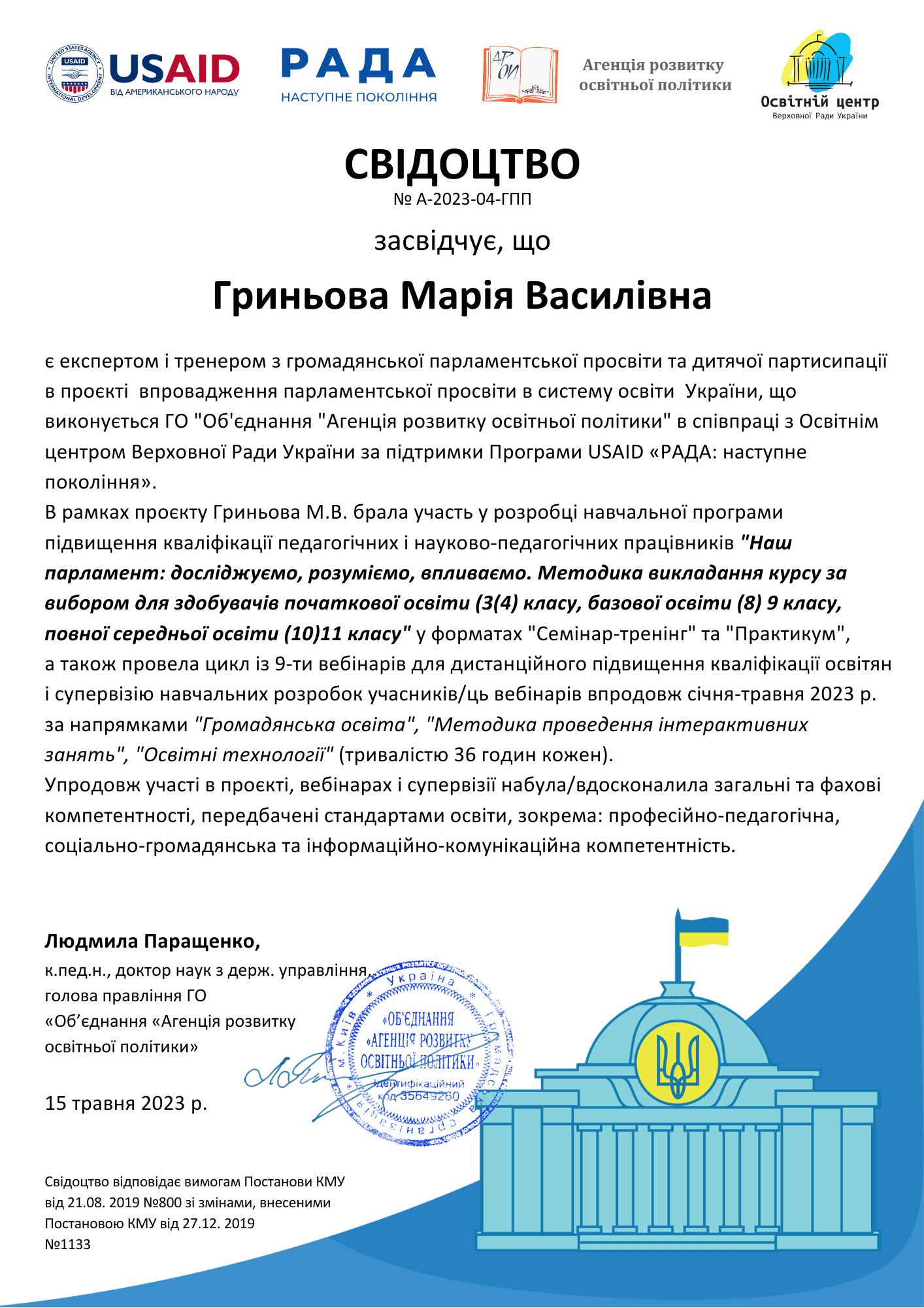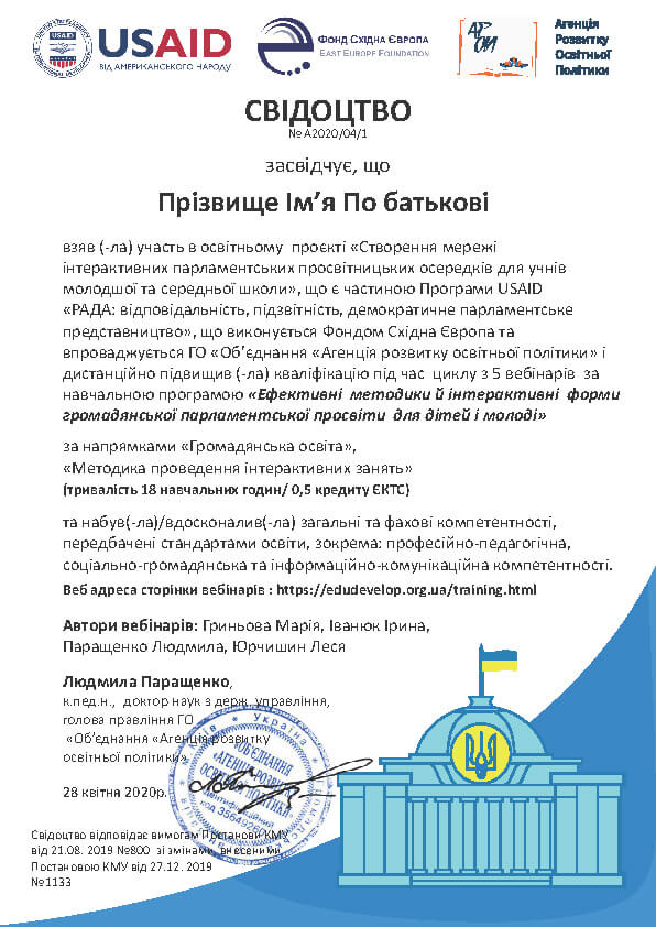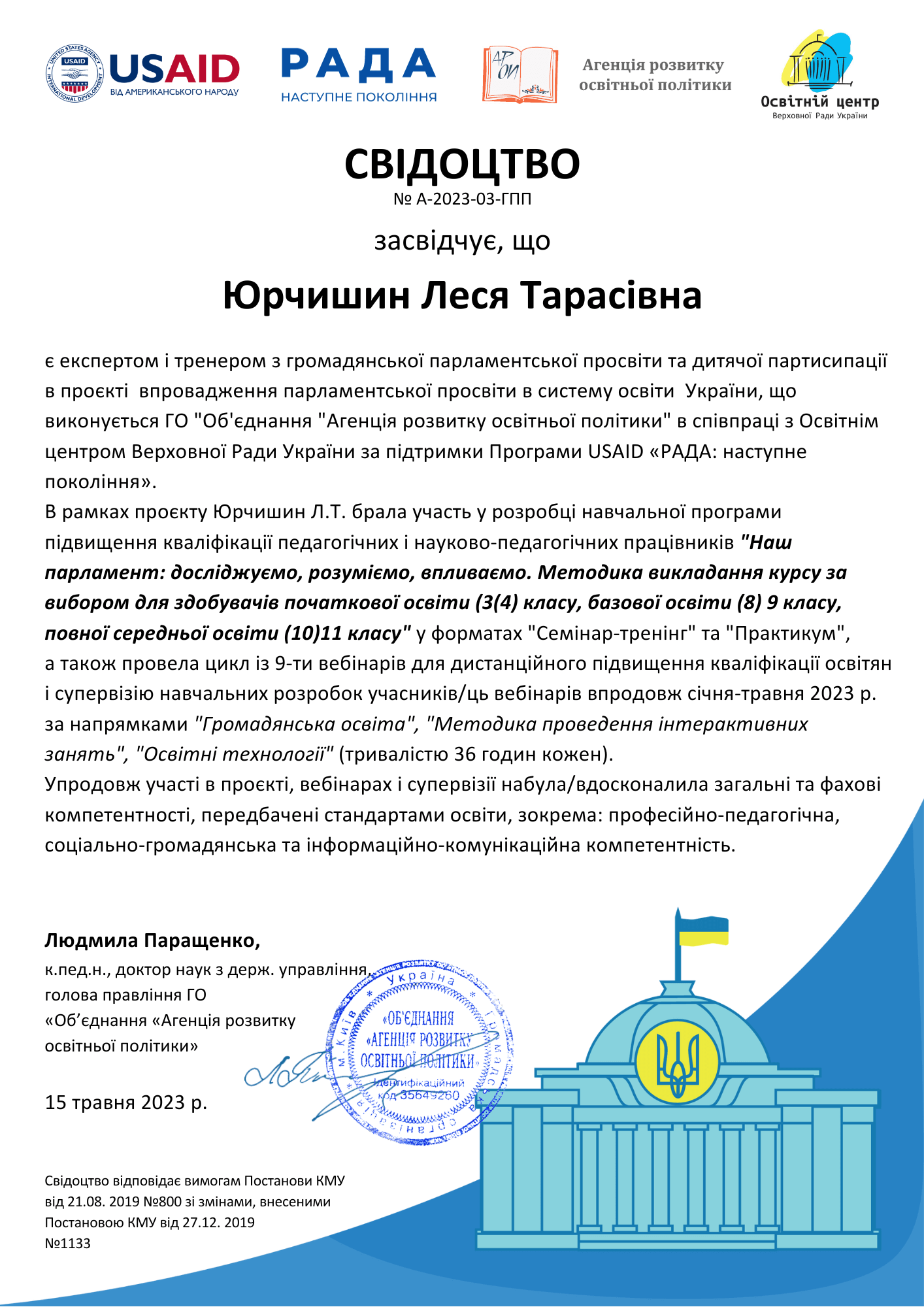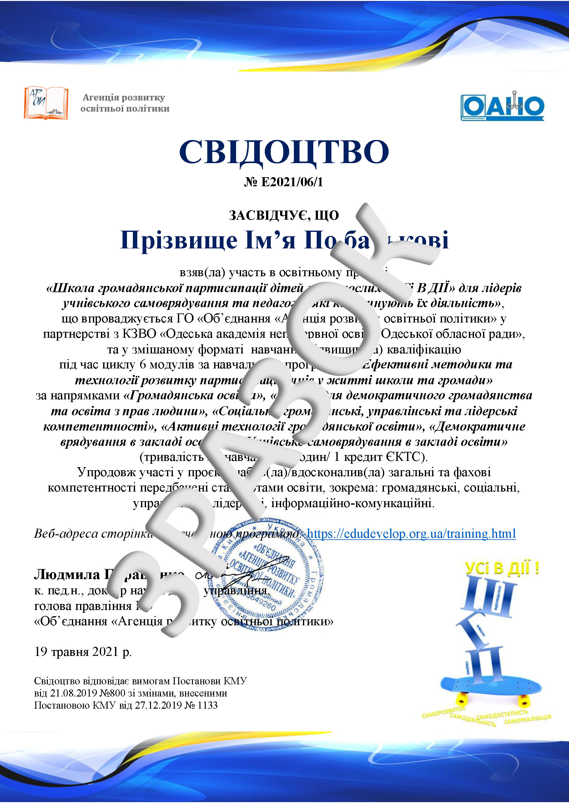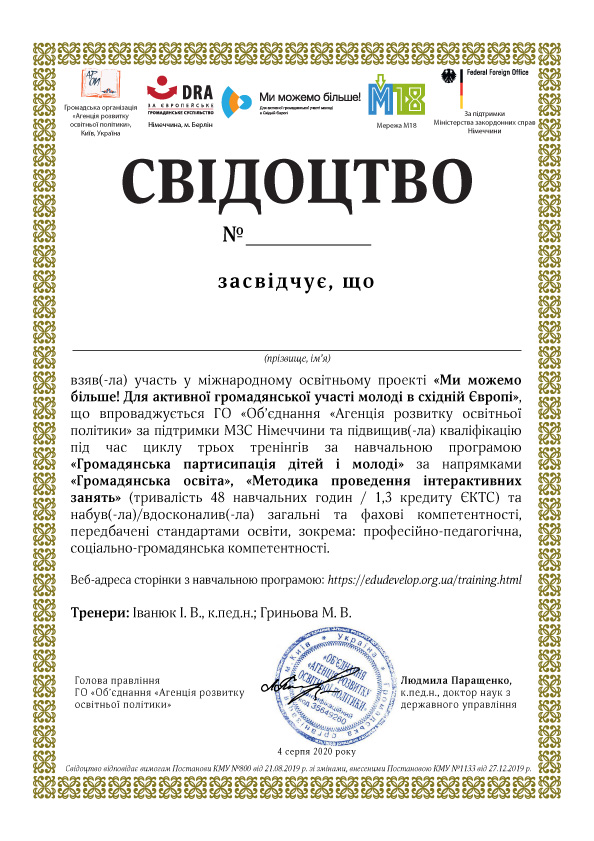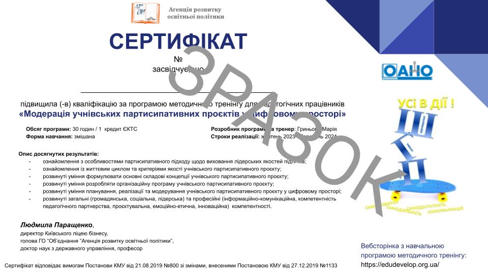 Програма підвищення кваліфікації педагогічних працівників (за видом освітньої послуги «МЕТОДИЧНИЙ ТРЕНІНГ») Модерація учнівських партисипативних проєктів у цифровому просторі | |